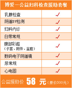 榆林博爱妇科医院“2016中白求恩百万公益援助基金”活动正在进行中,女性朋友通过网上预约,可申请白求恩百万公益援助基金援助补贴,原价300元8项妇科只需58元检查,现在只要非常适合有下腹病症状的女性朋友。